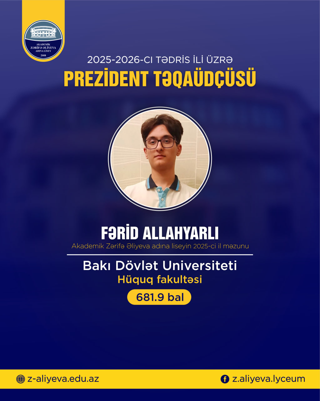 Akademik Zərifə Əliyeva adına liseyin 2025-ci il məzunu Fərid Allahyarlı Prezident təqaüdünə layiq görülüb.